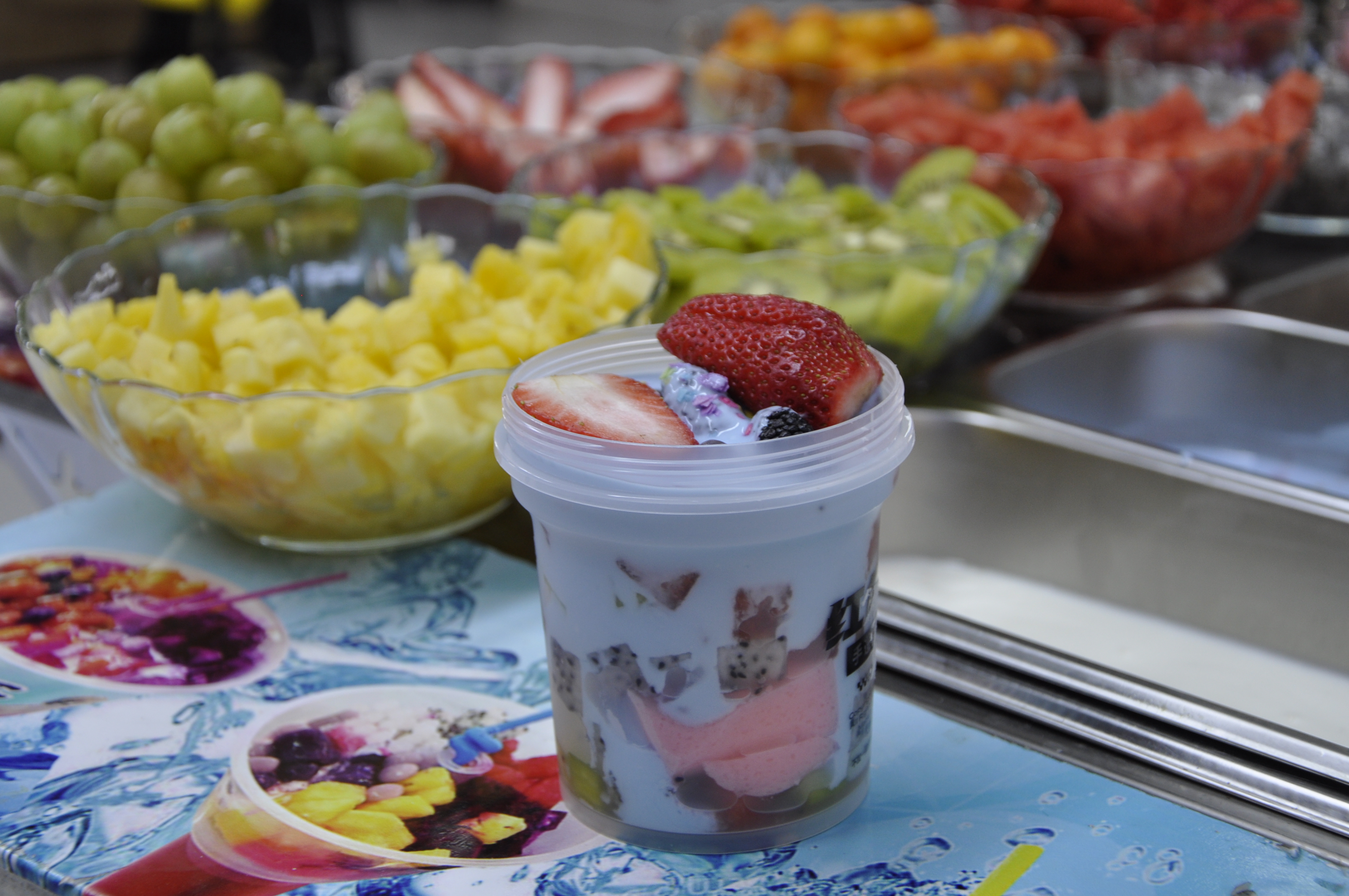 市場(chǎng)熱度:水(shuǐ)果撈是近年來(lái)流行(xíng)的一種健康美食,它集水(shuǐ)果、酸奶、小料、幹果等于一體(tǐ),酸甜清潤的各類水(shuǐ)果搭配珍珠、西米、燒仙草等Q彈小料,澆淋不同口味的酸奶,撒上(shàng)葡萄幹、山(shān)楂片等幹果,拌勻後食用,口味豐富,賞心悅目,極受顧客歡迎。目前,各類專營水(shuǐ)果撈的店(diàn)鋪層出不窮,售賣形式有(yǒu)的按斤稱量,有(yǒu)的按份出售,還(hái)有(yǒu)的做(zuò)成自助式水(shuǐ)果撈,但(dàn)無論哪種售賣形式,都有(yǒu)着極好的銷量和(hé)超高(gāo)的毛利率。